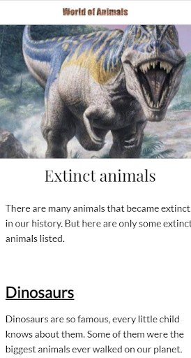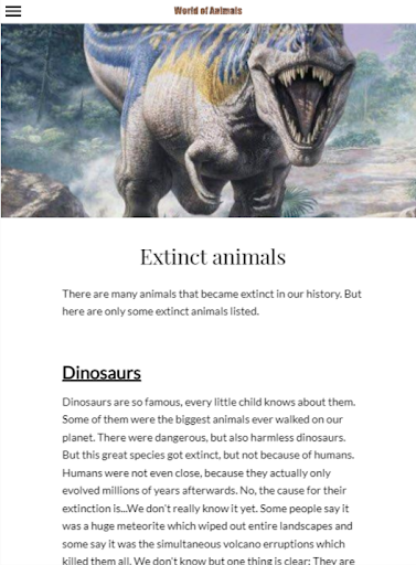 In this app some extinct animals are listed, which have gone extinct and we can hardly imagine how it would be when they lived now. With this app it is possible. Under every extinct animal there is a text which describes what would be if they hadn't gone extinct.