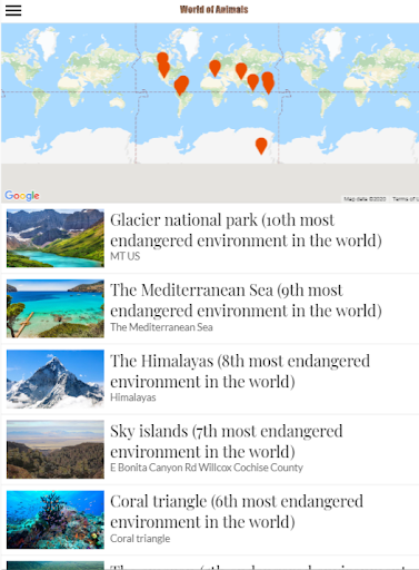 Maybe you have heard about locations which are completely polluted with plastic or which are victim to climate change, like the Antarctica. In this app you can find the top 10 environments which are endangered due to pollution or climate change.
