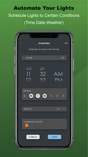 Schedule Timer Set lights to activate during certain conditions (time, date, and weather).