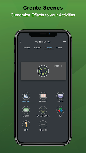 Create Scenes Create unique scenes with customizable effects, color cycles, brightness, and speed.