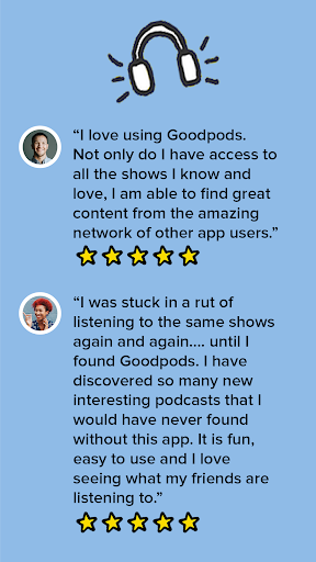 Goodpods is the podcast app designed for all listeners, from the podcast addict to the podcast newbie. Like and comment on podcasts that others share, create discussions, join groups and share thoughts on podcasts that pique your interest. Subscribe to shows, follow your friends, interact with podcasters and hosts to find your listening community!