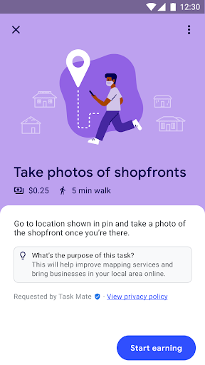 Complete tasks for your organization using the Task Mate app. Examples of tasks include taking a photo of a nearby restaurant, answering survey questions, or helping translate sentences from English to your local language.