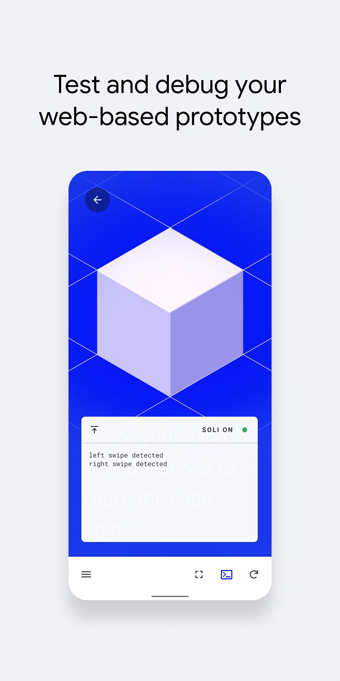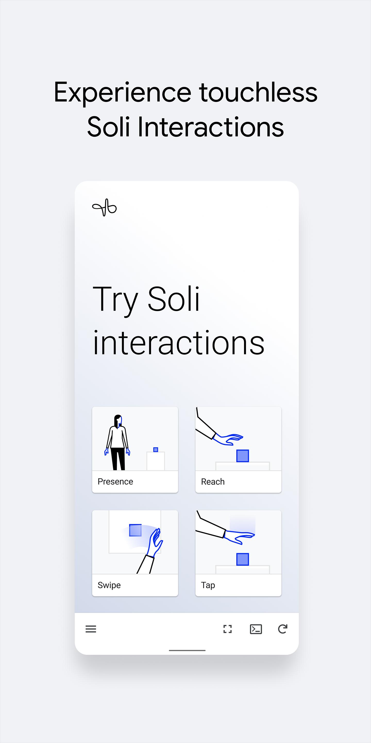 Soli Sandbox is a way to connect your web prototypes to Soli interactions on Pixel 4. Create a prototype with your favorite tools, and set it in motion with Soli gestures through the Soli Sandbox app. You’ll be able to use touchless swipes, taps, and more in your own prototypes!