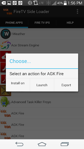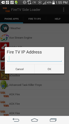 Open the AGK Fire app, Enter you Fire TV/Stick IP Address or Select from pre populated Fire TV IP'S on Fire TV IPS TAB