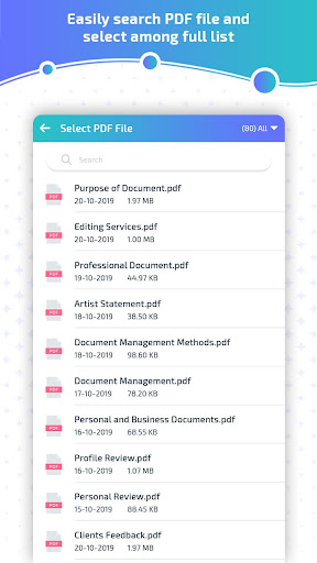 - Easy to select PDF file from list or use directly search option to select file, also sort file by name and size.
