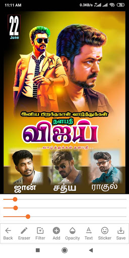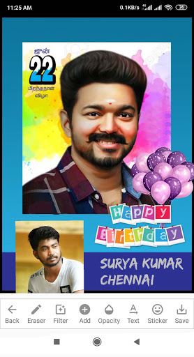 Tamil and Telugu Birthday Banner maker app helps you to create Tamil and Telugu birthday Banners. Just upload background image, add pictures and Stickers and thats it. Your Birthday Banner is ready within few clicks!