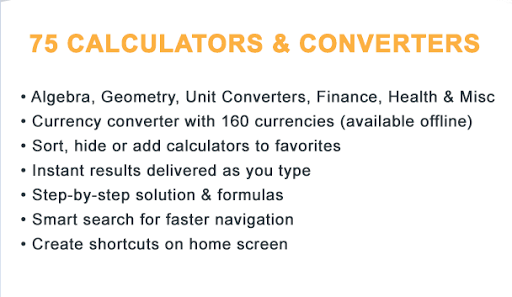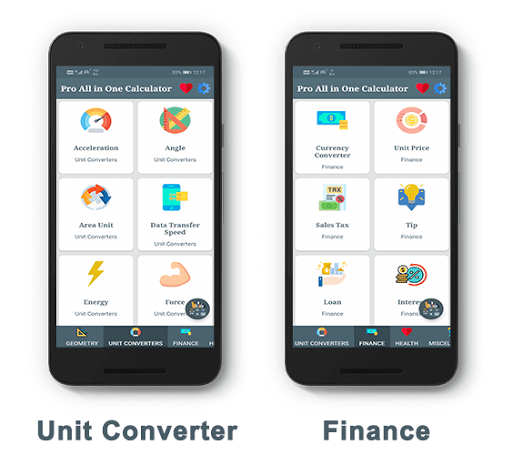 All-in-one Pro calculators a free calculator app for android featuring over 70 calculators and unit converters categorized under finance, health, women, construction, lifestyle and everyday math.