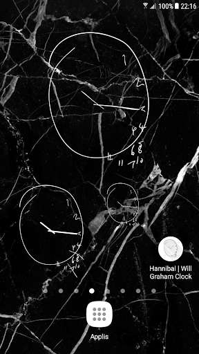 A simple, white or black, analogue clock widget based on the clocks drawn by NBC's Hannibal character, Will Graham.