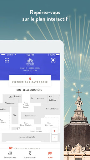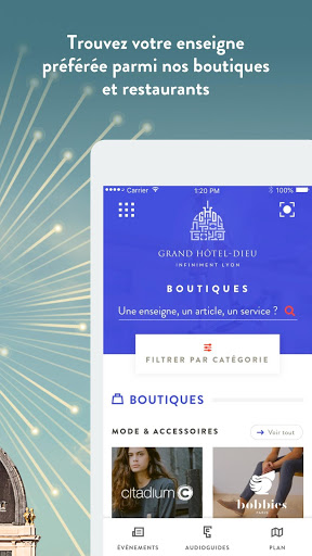 Accédez rapidement et facilement à tous les commerces, restaurants et lieux de vie du Grand Hôtel-Dieu. Suivez toutes les actualités, retrouvez les offres exclusives et les Grands événements du moment. Entrez dans l’Histoire de ce lieu emblématique, siècle par siècle, avec les audio-guides. En fonction de votre temps, vous pourrez écouter la Grande Visite ou sélectionner l’audio-guide qui vous intéresse. Pour vous aider à vous repérer, vous aurez également accès au plan interactif. Grand Hôtel-Dieu, grande application : retrouvez toutes les informations essentielles, à portée de main.
