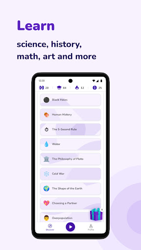 - Choose what sparks your curiousity: philosophy, math, words, history, science, self growth, iq or even psychology facts!
