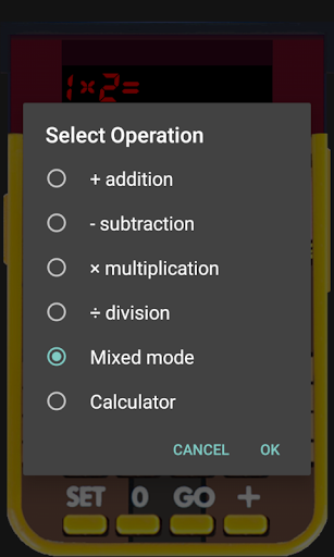 To change the operation: press [SET], then the type [ ] [-] [*] [/], or [9] for mixed operation mode. Finally press [GO].