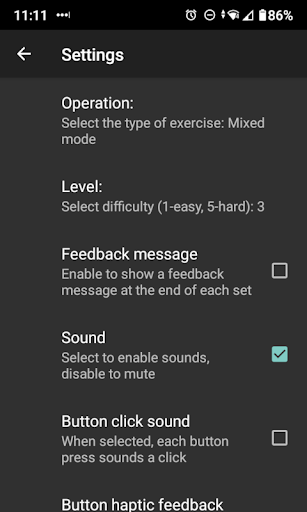 Enter your answer by pushing the number keys. If you're right, the next problem will be presented. If you're wrong, "ERROR" is displayed. You're given two more tries, then the correct answer is displayed. After ten problems, your score - the number of right answers and the time it took to solve, are displayed. A feedback dialog will rate you with 1 to 5 stars. Then another set of ten problems begins with the same operation at the same level.