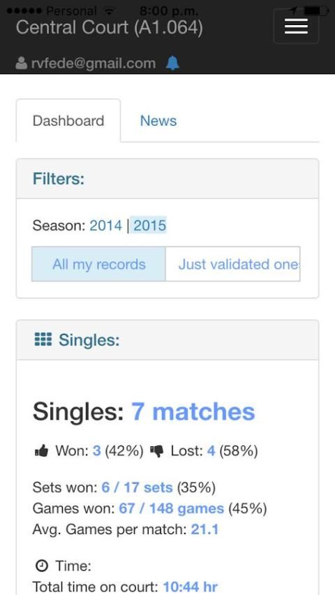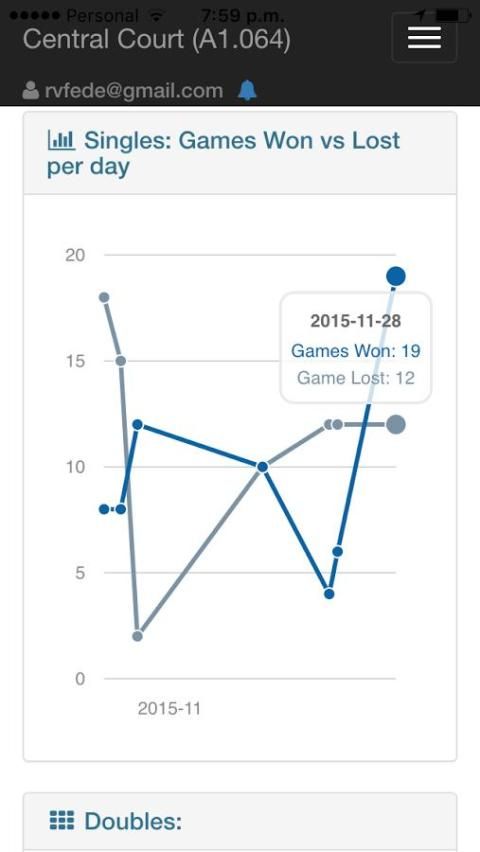 Here, you can view statistics of your tennis based on singles and doubles categories, and the graphical representation of won / lost games per match day. The information displayed is based on the data entered by you and your friends.