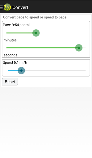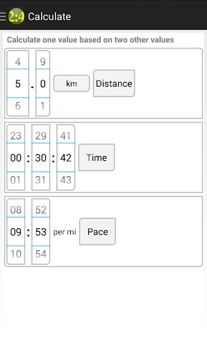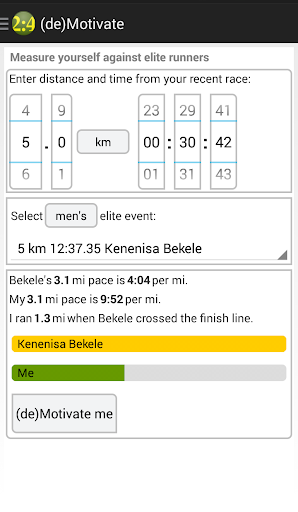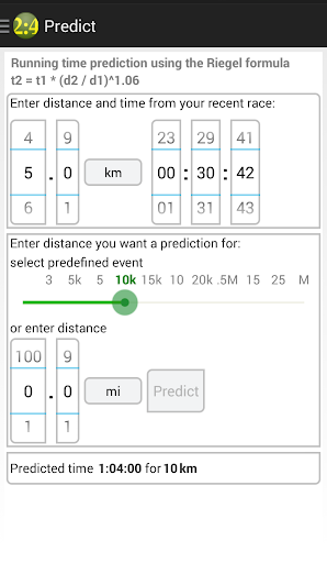 - Calculate distance, time and pace. - Convert pace to speed. - Race time prediction using the Riegel formula. - Compare your best times against elite runners using persuasive and (de)motivating animation. - Support for imperial and metric units.