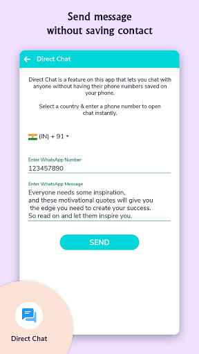 Use Direct Chat to send messages to anyone without saving their phone numbers in your device. Its great features in application that we dind't need to save number