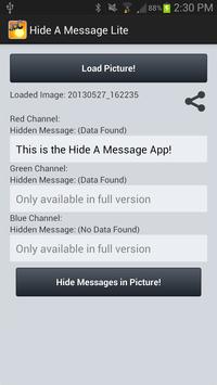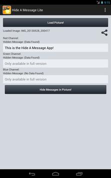 Hide messages in pictures for your friends and others to find! Hide A Message will encode messages in any picture which is in any format without changing how the picture looks. Just choose a photo from your gallery and type your message into the app and it will hide it.