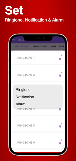 BTS Free Ringtones Application contains almost 100 BTS Ringtone as Free Download, then you can select any BTS Ringtones for free and set default ringtones, message ringtones and Bts Alarm tone or Alert.