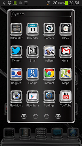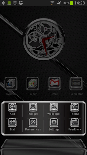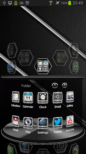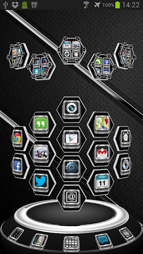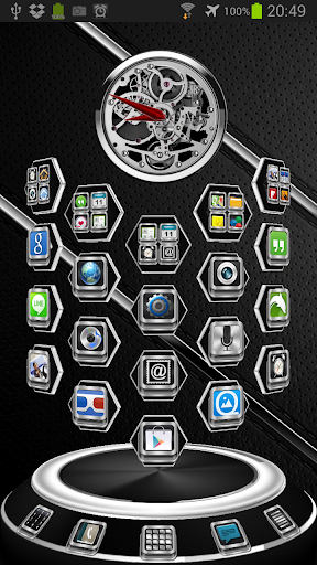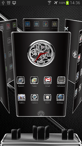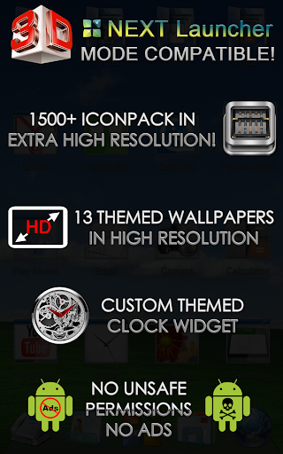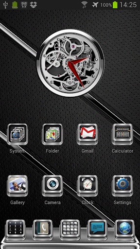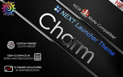 Next Launcher 3D theme. Extremely detailed and high quality elegant and modern Next Launcher theme with high definition graphics including a 1500 pack of HD icons, 13 custom themed HD wallpapers, and a metal clock widget, to give very detailed and defined graphics even in devices with the highest resolution screens. Everything is themed to the last detail, using metallic textures, lighting effects, reflections and gradients to give a great contrast and quality look.
