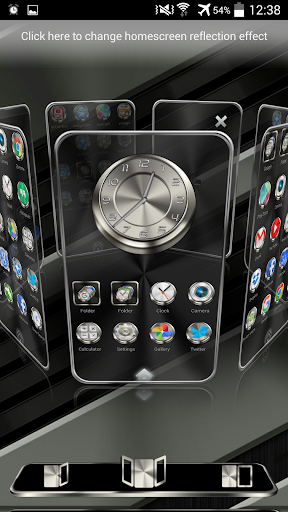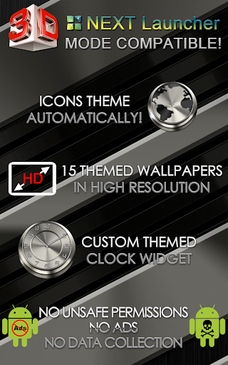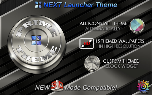 Next Launcher 3D theme. Extremely detailed and high quality elegant and modern Next Launcher theme with high definition graphics auto-themed icons, 15 custom themed HD wallpapers, and a metal clock widget, to give very detailed and defined graphics even in devices with the highest resolution screens. Everything is themed to the last detail, using metallic textures, lighting effects, reflections and gradients to give a great contrast and quality look.