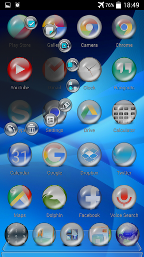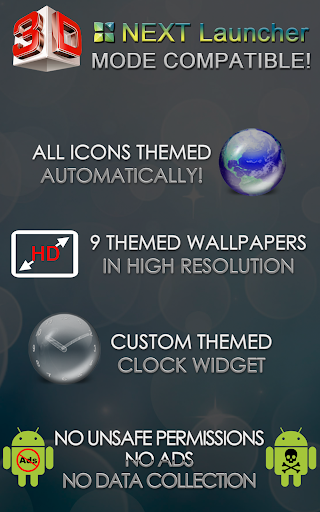 IMPORTANT! The Next Launcher Theme Sphere CLOCK widget you see in the screenshots is included in the theme, you can select it from the system wigdet list in Next Launcher (make sure you haven't moved the app to the SD Card).