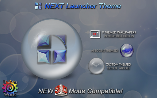 Next Launcher 3D theme. Extremely detailed and high quality unique and colorfull Next Launcher theme with high definition graphics auto-themed icons, 9 custom themed HD wallpapers, and a metal clock widget, to give very detailed and defined graphics even in devices with the highest resolution screens. Everything is themed to the last detail, using metallic textures, lighting effects, reflections and gradients to give a great contrast and quality look.
