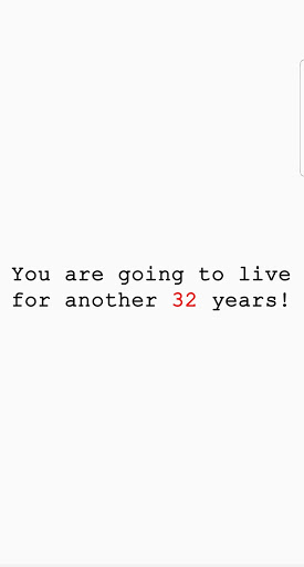 Ce temps évaluera combien de temps plus longtemps que vous allez vivre.Vous aurez posé des questions concernant votre style de vie personnel et des résultats, vous aurez une estimation sur le nombre d'années que vous avez encore restées sur Terre.Alors faites compter tous les jours, le temps est précieux et que vous ne seriez pas autour pour toujours!