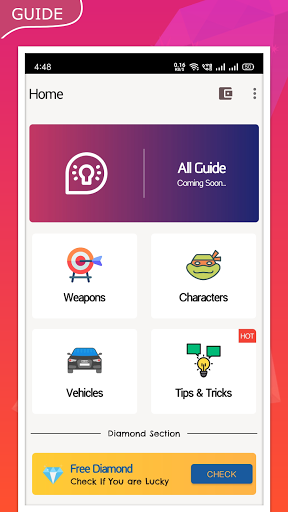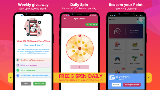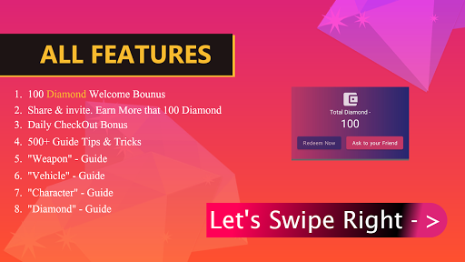 Daily Free Diamonds app guide help you to how you can get free and unlimited Diamonds from f.f . It also help you to how to play like pro . There are lots of tips and tricks if you apply your game will be improved and you can play like a pro. Try this tips and tricks to get unlimited ff Diamonds . If you also need tips and tricks how to play then . This app is also for you. There are lots of guides if you apply you can easily Fire get free Diamonds , Tips and Tricks , how to use weapons. This is a best Fire Guide app that help you to easily get free Diamonds.