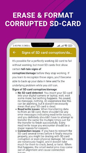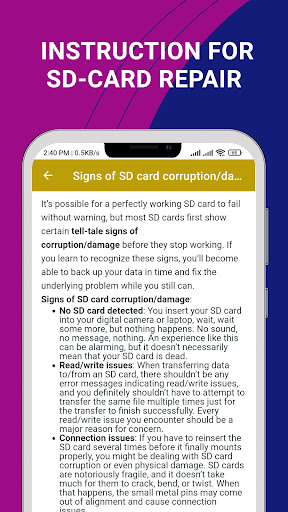 Your Android phone is not working properly? Have you accidentally deleted important data? Download our SD Card Repair: Best Tricks To Fix Damaged SD Card app and solve all the issues with your corrupted memory storage or missing files! Our handy troubleshooting guide provides easy solutions to all kinds of problems.