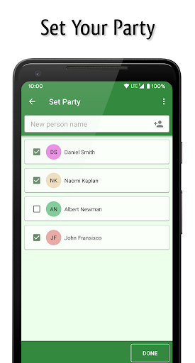 • Set up your party by adding the relevant persons, you can pick their colors and modify their names at any time.