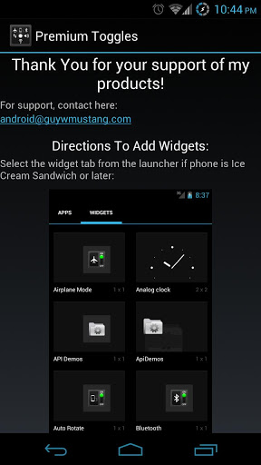 1.0.4: Fixed Wifi widget for Android 4.1.2. No airplane widget message box when adding any more unless on Android 4.2 or greater
