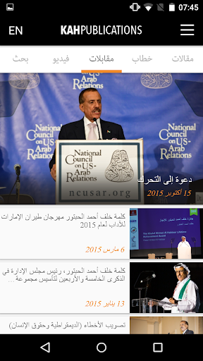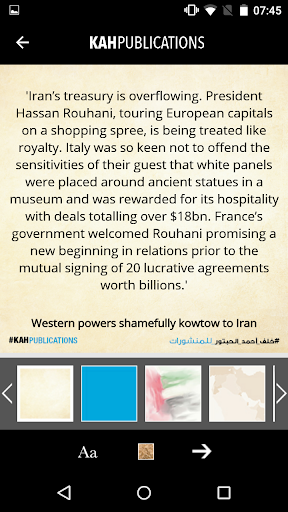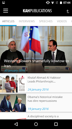 The KAH Publications app provides a platform to read about and discuss key issues from around the world, with a particular focus on the Middle East. This version presents a collection of articles, interviews, speeches, videos and research on a wide range of subjects with an emphasis on politics.
