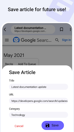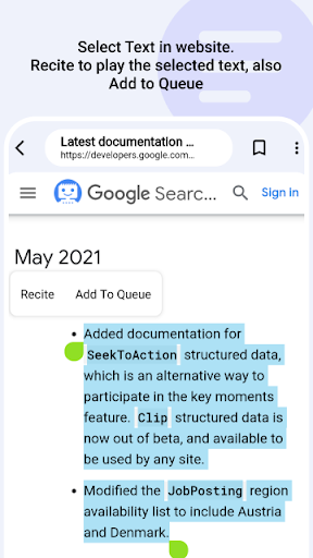 Open any web page by searching for it or by launching the web browser. Select text, start reciting or add it to the queue. To read the entire web page, simply select the paragraphs and add them to the queue. The sentences will be broken according to the delimiter.