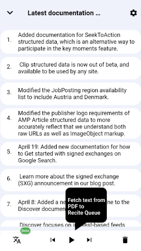Simply sit back and relax while the recite app reads it to you. The user has full authority of the queue and can perform actions such as play/pause, previous/next, and delete. The queue can also be filtered by deleting specific statements.