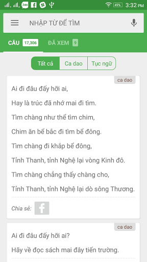 Ứng dụng cho phép tìm kiếm và đánh dấu những câu ca dao hay tục ngữ đã đọc xong.