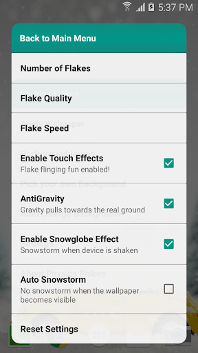 Fling the snowflakes around with a flick of the finger. Flake velocity is based on the speed of the swipe. This works just about any time the background is visible, including while swiping between homescreen panels & while navigating semi-transparent app launcher menus.