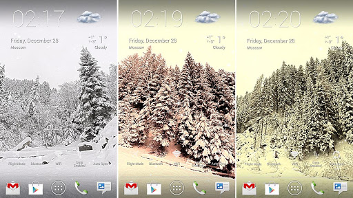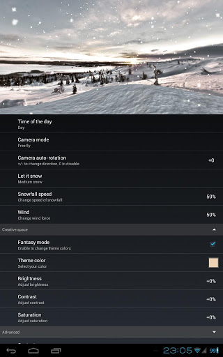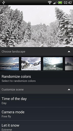Choose between forest, mountains, hills, rocks, valley or ice alien planet. Relax watching on gently falling snowflakes. Make it light snow or heavy snowfall, daytime or evening (automatic daytime requires Google Location Service to be enabled), windy or calm.