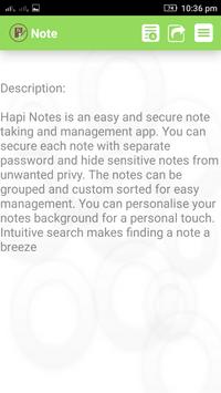 Hapi Notes is an easy and secure note taking and management app. You can secure each note with separate password and hide sensitive notes from unwanted privy. The notes can be grouped and custom sorted for easy management. You can personalise your notes background for a personal touch. Intuitive search makes finding a note a breeze