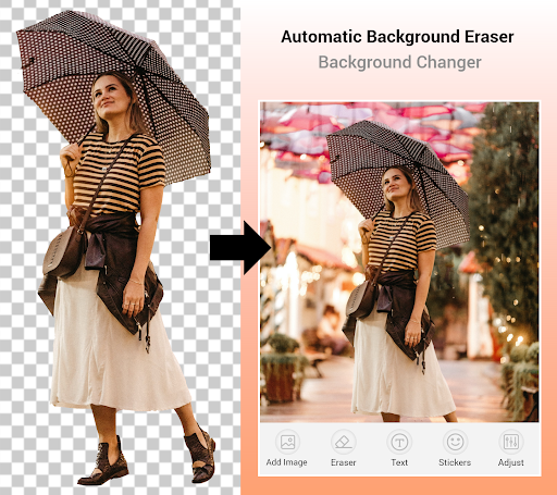 Automatic Background Eraser - Background Changer app you can also do photo editing. It provides facilities like add stickers, add text or change the text colour, Adjust background, Eraser, add image and apply backgrounds. You can also choose multiple backgrounds to set your image.