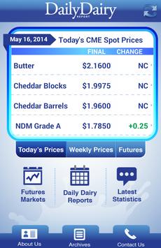 Staying connected to dairy markets while on the go has gotten even easier. The Daily Dairy app highlights CME daily cash cheese, butter, and nonfat dry milk (NDM) spot market action within minutes of the close. Additionally, Daily Dairy recaps weekly CME prices, averages and trading volumes, and provides a concise review of daily futures settlement prices for nearby milk, dairy products, grain, oilseed, and cattle contracts.