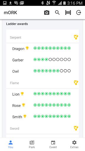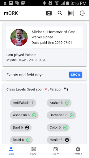 mORK is a mobile application for the players and administrators of Amtgard. mORK allows players to see a summary of their character and to easily upload a new ORK photo of themselves. mORK also allows a player to display a QR code of their account to their Chancellor for easy sign-in.
