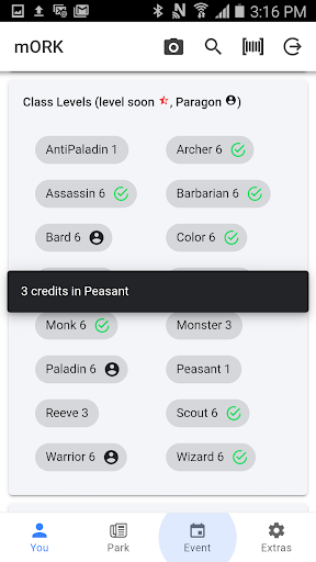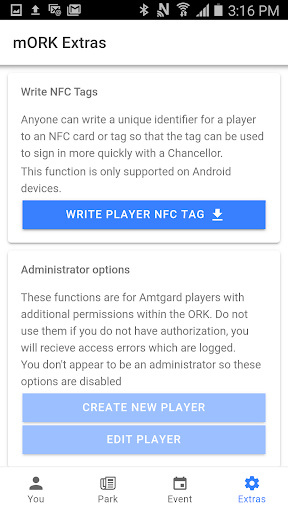 For Admins, mORK allows them 3 easy ways to sign in players for their daily or event credits. You can simply search for the character name, you can scan a QR code, or you can scan an NFC tag written by the mORK application. Typical NFC tags look like a plastic employee card or a small key fob sized disc.