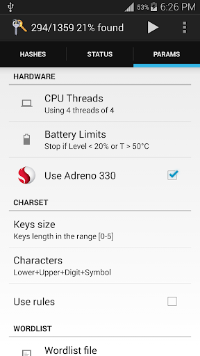 Battery aware: Hash Suite Droid automatically stops attacks when the battery's charge drops below or the temperature rises above a user-defined threshold.