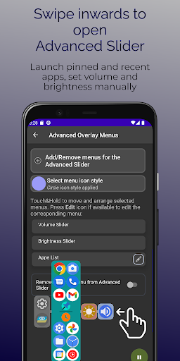 - (New in 2.00) Swipe inwards to display advanced slider. Pin apps to quickly launch them. See recent apps and switch easily.