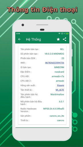 Ứng dụng "Xem thông tin điện thoại - Hệ thống & Phần cứng" sẽ cung cấp các thông tin hữu ích khi bạn cần tra cứu và cũng giúp bạn so sánh những điện thoại sử dụng hệ điều hành Android với nhau. Hãy tải ngay để có một công cụ hữu ích để kiểm tra thông tin điện thoại Android của bạn!