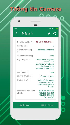 – Camera - Máy ảnh: Thông tin chi tiết về camera trước và sau trên điện thoại Android của bạn: độ phân giải hỗ trợ, chế độ tiêu cự v.v.