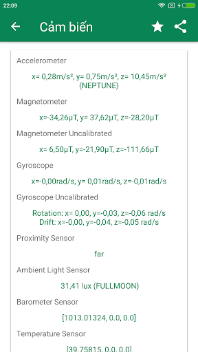 – Cảm biến: Kiểm tra tất cả các cảm biến trên thiết bị của bạn theo thời gian thực.