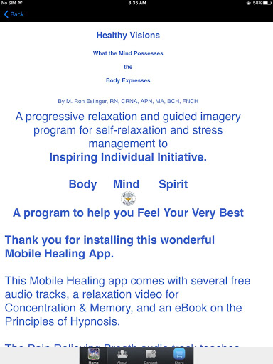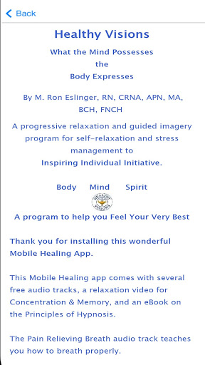This healing mobile app is based on years of academic research on the power of guided imagery, visualization and hypnosis in healing and wellness.