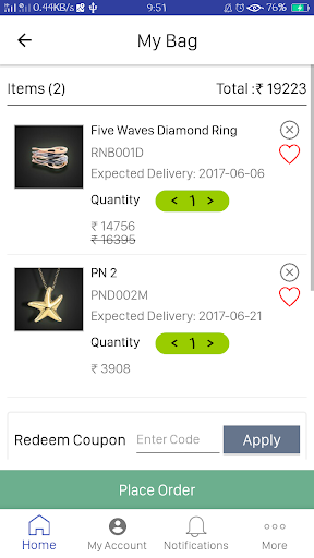 • Avail massive discounts: Never miss an offer! With mobile notifications, you’ll be the first to know of our best deals and discounts on your jewellery items. Moreover, some of our offers are mobile only!