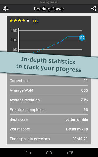 The results of each training exercise are charted for your review. More stars mean that you are getting closer to your objective: more effective reading skills and with it extremely high reading speeds.