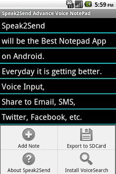Speak2Send is a simple notepad with speech input, you can send the record to other applications in your phone, such as SMS, Email, Twitter, FaceBook, etc.
